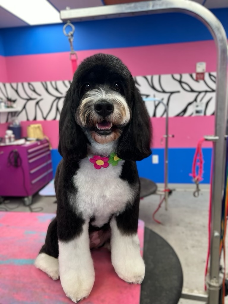 If your Bernedoodle arrives heavily matted, we’ll be honest with you about the options. A longer style isn’t always possible without hurting your dog during brush-out — in those cases, a shorter reset cut is the kind choice, and the coat grows back quickly.